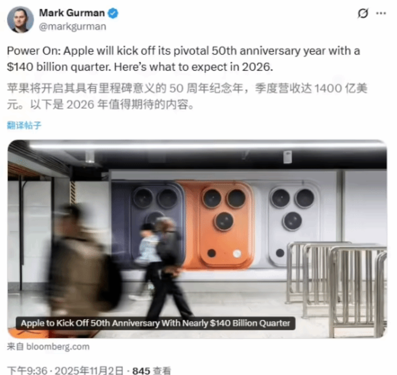 财务方面,苹果最新宣布,预计 2025 年年底的假日季度(即 2026 财年第一季度)收入将增长 10% 至 12%,达 1370 亿至 1390 亿美元,约为华尔街预期增速的两倍。